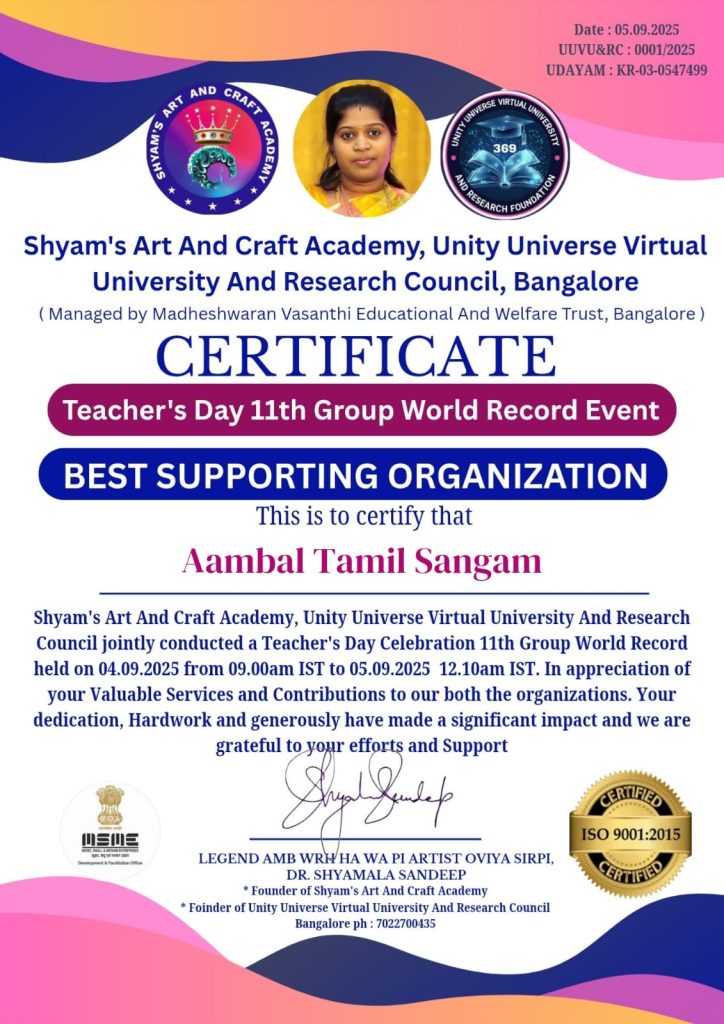 17 கோடி முறை எழுதப்பட்ட ஆசிரியர் தின உலக சாதனை நிகழ்ச்சியில் சிறப்பாக பங்கேற்றதைப் பாராட்டி ஆம்பல் தமிழ்ச்சங்கம் சிறந்த தோள்கொடுக்கும் நிறுவனம் என்ற விருது பெற்ற ஆம்பல் தமிழ்ச்சங்கம் & சிறந்த ஒருங்கிணைப்பாளர் விருது பெற்றது