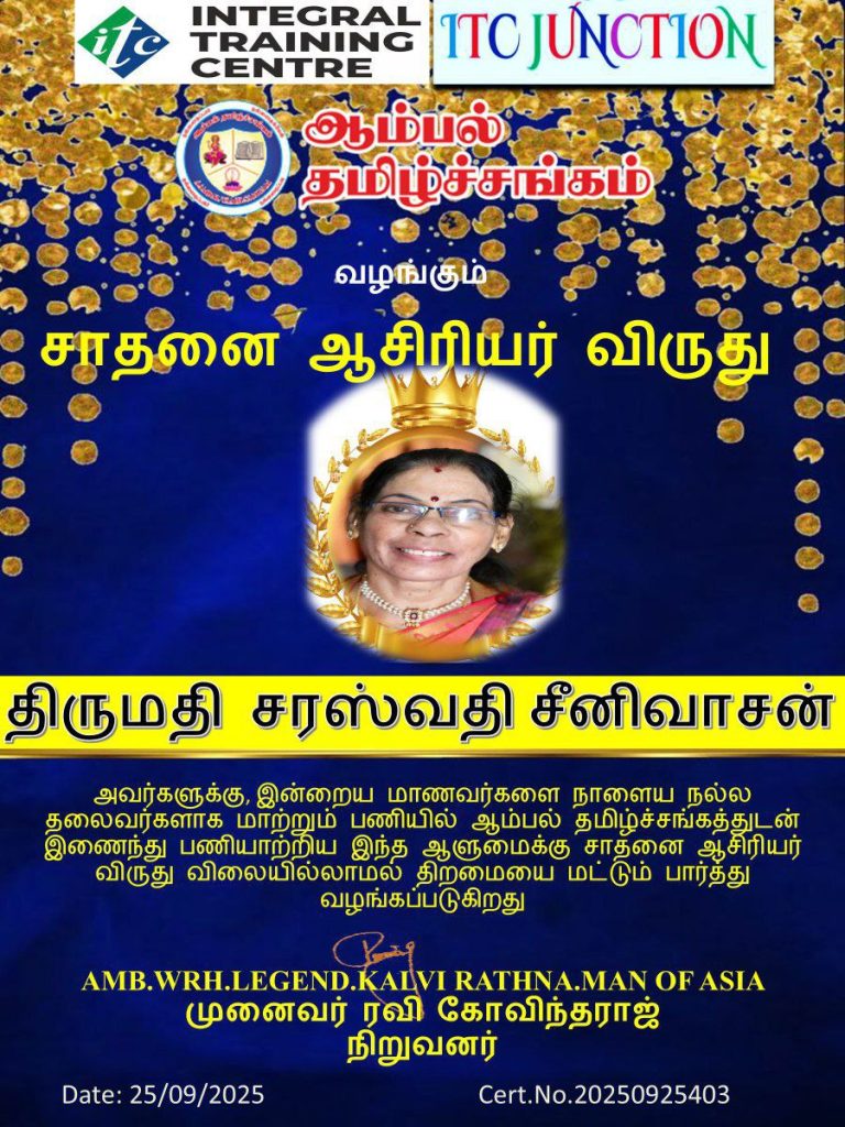 The daughter of renowned Tamil writer Dronan, Saraswathy inherited not only literary flair but also a deep passion for shaping young minds and beautifying spaces.