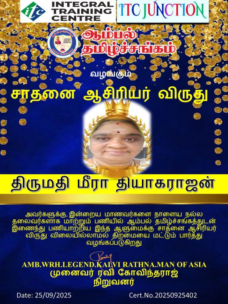 - All India Book of Records – World Record Holder (8 hours continuous Thirukkural writing)